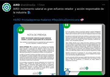 Santo Domingo, RD.- La Asociación de Industrias de la República Dominicana (AIRD) y sus empresas asociadas siempre han mostrado buena voluntad y compromiso con mejorar el nivel de vida de sus colaboradores, generar constantemente valor agregado, incrementar la productividad, y mantener los puestos de trabajo, incluso en medio de las dificultades generadas por la pandemia de COVID-19 a la producción.