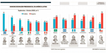 Según el estudio, reproducido en la versión digital del citado diario chileno, ponderó un conjunto de variables atribuibles a la aprobación y desaprobación que muestran los distintos mandatarios, entre las que se encuentran las acciones por la pandemia, los procesos sociales, así como factores políticos, manejo económico, entre otros.