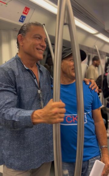 “Quería darme un bañito de pueblo con ustedes (…) Yo le dije vamos a meternos en el metro porque quiero darme un bañito de pueblo y conocer al pueblo dominicano”, dijo el actor a las personas en el metro y aprovechó para agradecer el apoyo que le dan en sus redes sociales.