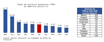 En América Latina, el crecimiento económico se mantendría moderado, con una expansión promedio para la región de 2.1 % en 2026. En tanto, la inflación permanece dentro del rango meta en la mayoría de los países. Considerando las perspectivas de mayores presiones inflacionarias externas, gran parte de los bancos centrales de la región han decidido mantener sin cambios sus tasas de política monetaria.