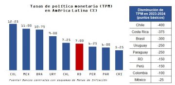 El Banco Central de la República Dominicana (BCRD), en su reunión de política monetaria de marzo de 2024, decidió mantener su tasa de interés de política monetaria (TPM) en 7.00 % anual. Asimismo, la tasa de la facilidad permanente de expansión de liquidez (Repos a 1 día) permanece en 7.50 % anual, mientras que la tasa de depósitos remunerados (Overnight) continúa en 5.50 % anual.