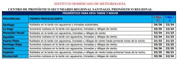 Santiago, RD. – Este martes, la presencia de una vaguada en varios niveles de troposfera y los efectos locales de calentamiento diurno estarán generando en el transcurso de la tarde hasta primeras horas de la noche, nublados con aguaceros fuertes localmente, tronadas y ocasionales ráfagas de viento sobre gran parte de nuestra región. Principalmente sobre las provincias de: Monseñor Nouel, Santiago, La Vega, Valverde y Santiago Rodríguez.