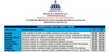 La influencia de una circulación anticiclónica que se manifiesta en todos los niveles de la tropósfera se está combinando con polvo procedente desde África, dominando de esta manera las condiciones del tiempo de nuestra área de responsabilidad y estarían limitando las lluvias significativas sobre gran parte de la región. Sin embargo, en horas de la tarde se observarán aumentos nubosos generadores de chubascos locales y posibles tronadas hacia zonas focalizadas de La Vega, Montecristi, Dajabón, Santiago Rodríguez y posiblemente Monseñor Nouel, debido a una débil vaguada que se extiende desde el océano Atlántico hacia Haití y los efectos locales.