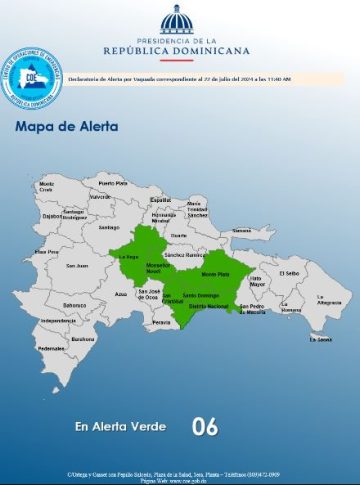 Santo Domingo, RD. – El COE coloca 05 provincias y al Distrito Nacional en alerta verde, debido a que tendremos ocurrencias de precipitaciones que pueden ser moderadas a fuertes con tormentas eléctricas y ráfagas de viento aislados, por la incidencia de una vaguada.