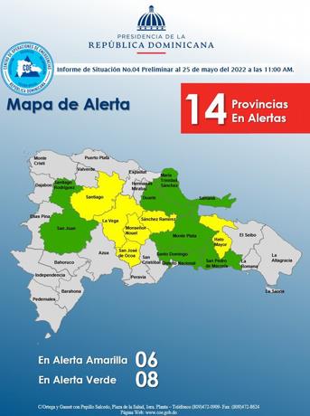 Mientras que en alerta verde están: Monte Plata, el Gran Santo Domingo, San Pedro de Macorís, Santiago Rodríguez, María Trinidad Sánchez, Samaná, Duarte, en especial el Bajo Yuna y San Juan.