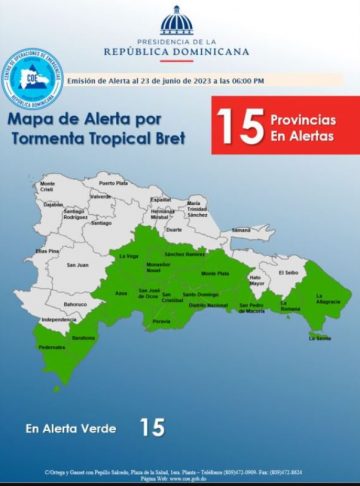 El Centro de Operaciones de Emergencias (COE) puso en alerta verde a 15 provincias ubicadas sobre todo en el litoral costero Caribeño, el Nordeste, Cordillera Central y la zona fronteriza del país ante el paso de la tormenta Tropical Bret.