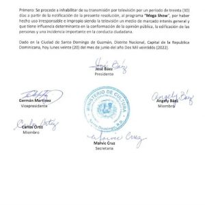 Por esa razón resolvió prohibir la difusión del programa “Mega Show” a través de la televisión por un período de 30 días. La aplicación de la resolución entra en vigencia a partir de la notificación, por haber hecho uso irresponsable e impropio, siendo la televisión un medio marcado de interés general que tiene influencia en la conformación de la opinión pública, la edificación de las personas y una incidencia importante en la conducta ciudadana”.