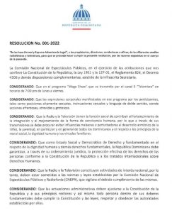 De acuerdo con la resolución No. 001-2022, los conductores del referido programa, que se emite a las 7:00 pm. por Telemicro, canal 5 usaron expresiones y posiciones sexuales ofensivas.