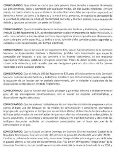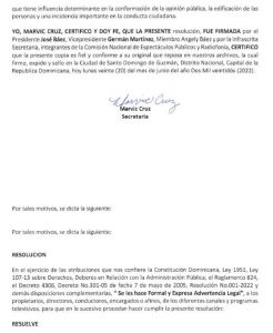 El dictamen firmado por el titular de la CNEPR, Joseph Báez, así como Germán Martínez, vicepresidente, Marvic Cruz, secretaria, así como por los miembros del órgano, Angely Báez, y Carlos Ortiz, especifica en otro de su considerando dichas acciones atentan contra el buen uso del lenguaje en los medios de comunicación “y constituye expresiones impropias de un programa, al tiempo que sus acciones afectan el derecho delos televidentes a disfrutar de los medios de comunicación sin que sean afectada o lacerados el orden público, la buena costumbre, el uso propio y adecuado del lenguaje y la dignidad humana”.