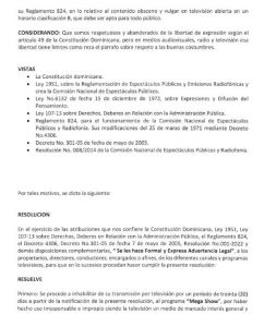 Por esa razón resolvió prohibir la difusión del programa “Mega Show” a través de la televisión por un período de 30 días. La aplicación de la resolución entra en vigencia a partir de la notificación, por haber hecho uso irresponsable e impropio, siendo la televisión un medio marcado de interés general que tiene influencia en la conformación de la opinión pública, la edificación de las personas y una incidencia importante en la conducta ciudadana”.