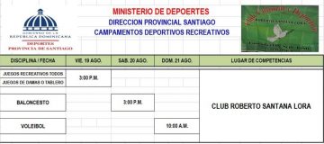 Santiago, RD.- La Dirección Provincial de Deportes MIDEREC-Santiago, la cual encabeza el señor Tony Peña R, anunció que siguen esta tarde, viernes, a partir de las 3:00pm, en el techado y los alrededores del club Roberto Santana Lora, de los Jazmines, Santiago, los campamentos deportivos-recreativos.