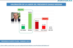 Puerto Plata. En el caso de Puerto Plata, en el mismo estudio de medición aplicado en febrero de este año dio como resultado que un 62,1% valoró el trabajo del Presidente de la República como bueno y muy bueno, divididos entre 52.0% (bueno) y 10.1% (muy bueno).