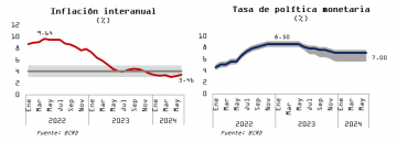 En cuanto a la inflación, los modelos de pronósticos indican que las presiones inflacionarias se mantendrían moderadas. De forma particular, la inflación se ubicaría entre 3.0 % y 3.5 % para el cierre de 2024 y 4.0 % en 2025, mientras la inflación subyacente permanecería cerca de 4.0 % durante todo este período.