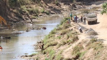 Por el sector la Sal y los Cartones del municipio de Dajabón se puede observar como haitianos bajan al río masacre con cubetas para extraer la arena, misma que amontonan a la orilla para luego montarla en camiones para retirarla de la zona.