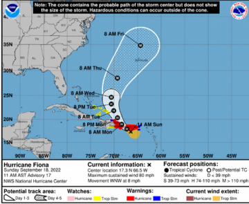 En la trayectoria pronosticada, el centro de Fiona se acercará a Puerto Rico durante la mañana de hoy, y puede moverse cerca o sobre Puerto Rico esta tarde.