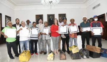 Santiago RD.- La representante del Poder Ejecutivo, Rosa Santos, reconoció este miércoles a 11 limpiabotas que durante años han realizado su labor en los parques Colón, Duarte y los Chachaces de esta ciudad.