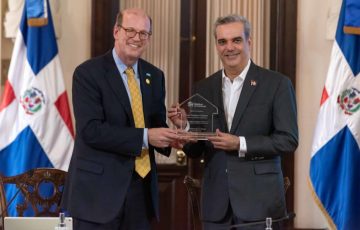 Jonathan Reckford, CEO de Hábitat, entregó al presidente Abinader un reconocimiento durante la actividad celebrada en el salón Las Cariátides.