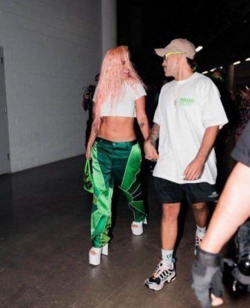 En las imágenes, se observan a ambos artistas agarrados de mano, sonriendo mientras se miran fijamente; de igual forma, ambos vestían de color verde y blanco.