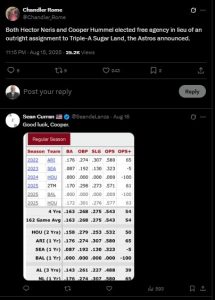 «Tanto Hector Neris como Cooper Hummel eligieron la agencia libre en lugar de una asignación directa a la sucursal de Triple A», escribió Rome en su cuenta personal de la red social X.