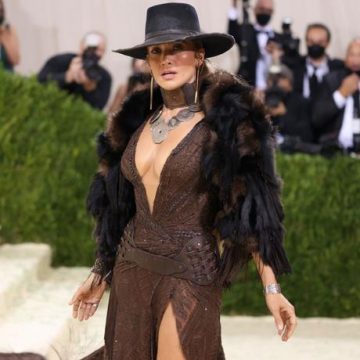 Jennifer López, que llegó sin Ben Affleck pero luego se reunió con él, parecía recién llegada del Lejano Oeste con un vestido marrón brillante con sugerente corte en el muslo, una estola de pelo y un sombrero tejano obra del diseñador emblemático de la moda estadounidense Ralph Lauren.