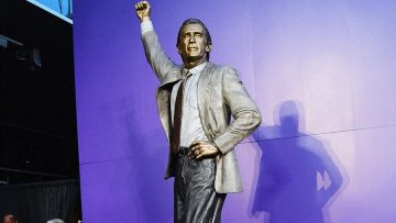 Como parte del homenaje, los Lakers inauguraron fuera del pabellón una estatua de bronce de casi 2,5 metros y 230 kilos de Riley, actual presidente de los Miami Heat, junto a las de Abdul-Jabbar y Magic Johnson.