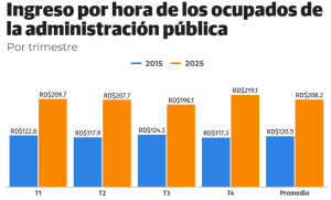 El ingreso por hora de los servidores públicos solo fue superado por el de los ocupados del sector intermediación financiera y seguros (288.2 pesos), enseñanza (259.2) y los de salud y asistencia social (243.2 pesos), según los registros del BCRD.