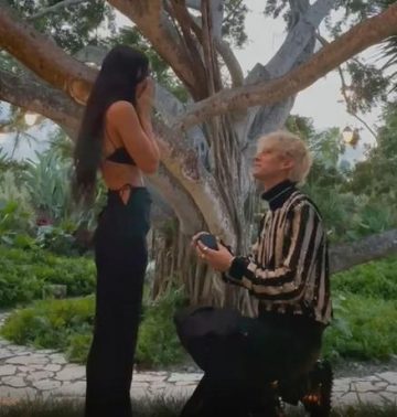 En el tope de unas escaleras, enmarcados por un árbol y amenizados por el “cantar del coquí” (anfibio nativo de la isla similar a una pequeña rana), Machine Gun Kelly se puso de rodillas y abrió la pequeña caja que contenía el anillo.
