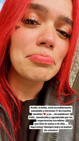 “Anahí, la bebé, está increíblemente saludable y hermosa. Su mamita también… y yo… sin palabras”, escribió la intérprete de “Provenza” junto a una imagen donde se deja ver lágrimas de emoción corriendo por su rostro.