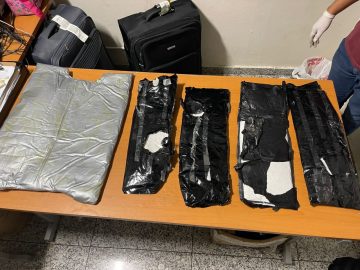 Ocupan cinco paquetes de presunta cocaína en doble fondo de varias maletas; arrestan tres extranjeros
