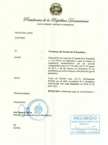 En el decreto 335-23, leído en la sesión de hoy por el presidente de la Cámara Baja, Alfredo Pacheco, el Ejecutivo indica que la legislatura será extendida desde este jueves 27 de julio hasta el próximo 15 de agosto.
