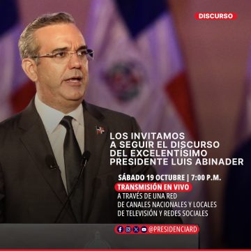 “Hoy, a las 7:00 p.m. el presidente @LuisAbinader se dirigirá a los dominicanos y dominicanas, a través de las redes sociales de @PresidenciaRD y una red de canales de televisión y emisoras de radio nacionales y locales.”
