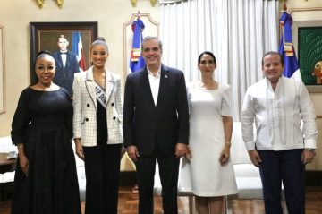 Martínez Founier, llegó acompañada al Palacio Nacional de Magali Febles, quien es la directora de Miss Universo República Dominicana.