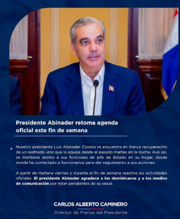 En un comunicado publicado en las redes sociales por Alberto Caminero, Director de Prensa del Presidente, se comunicó que el Presidente Luis Abinader, se reintegrará a sus labores desde este viernes 23 de enero, tras estar afectado por un resfriado viral desde el pasado martes en la noche.