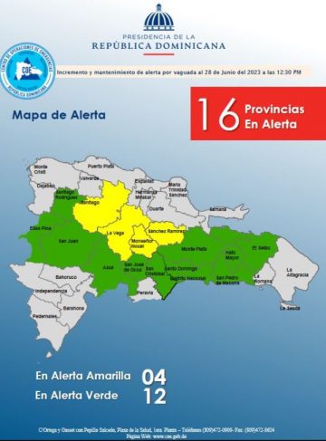 La entidad detalló que son 12 las que están en alerta verde: San Cristóbal, Monte Plata, Distrito Nacional, Santo Domingo, El Seibo, Elías Piña, San Juan, Hato Mayor, Azua, San Pedro de Macorís, Santiago Rodríguez y San José de Ocoa.