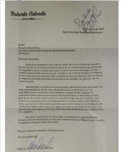 El exalcalde y miembro del Comité Central del Partido de la Liberación Dominicana (PLD), Roberto Salcedo, renunció a esa organización política en una carta dirigida al secretario general, Reinaldo pared Pérez. Salcedo dice que tomó la decisión por “obligación moral”.