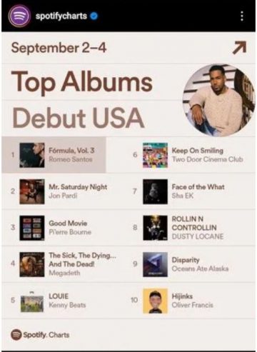 Santo Domingo, RD. – El “rey de la bachata”, Romeo Santos, logró colocar su álbum “Fórmula Vol.3”, que presentó la semana pasada en Miami, en el primer puesto de las listas “Top Álbum Debut Global” y “Top Álbum Debut USA” de Spotify, según informó su casa discográfica, Sony Music.